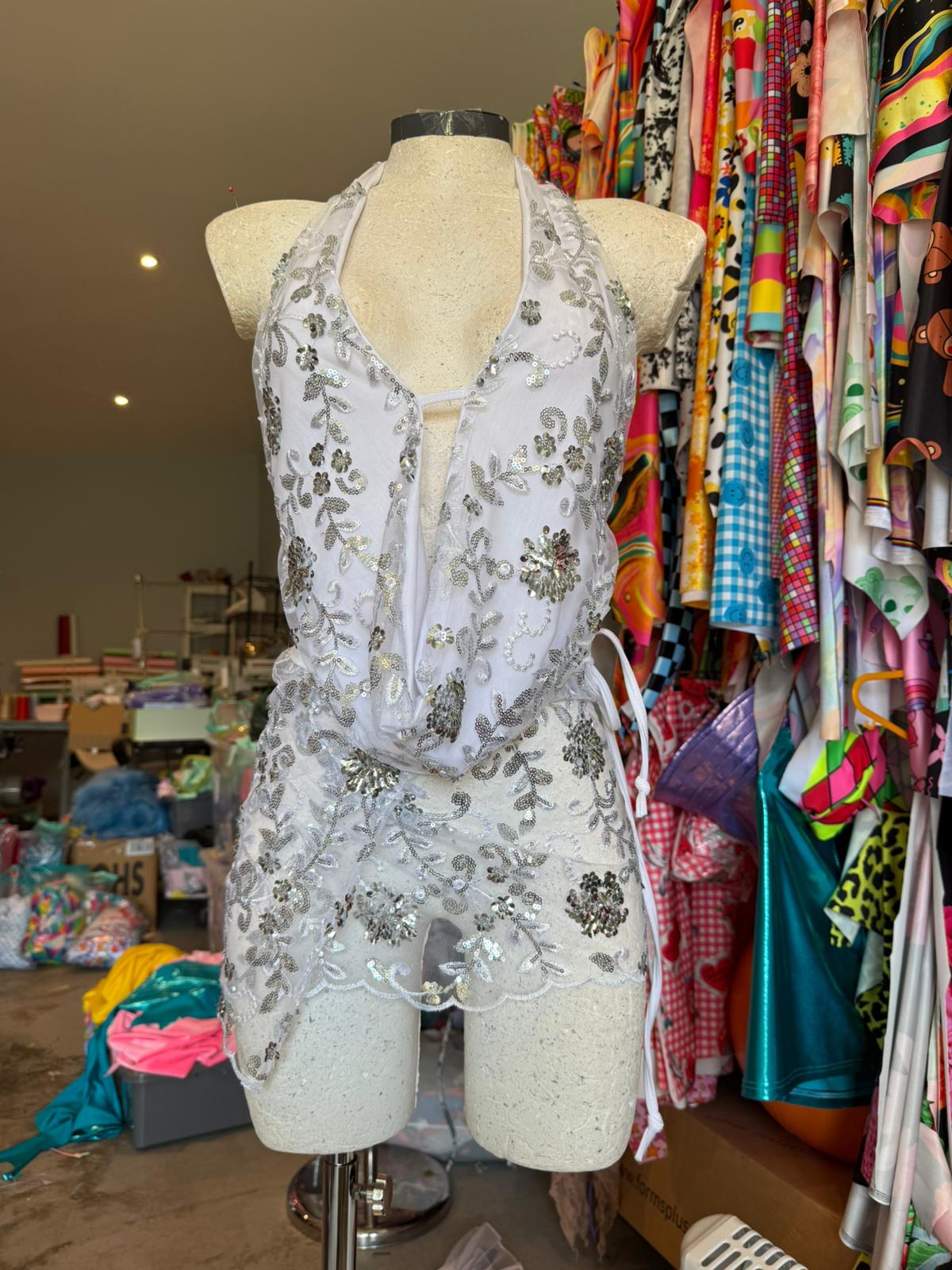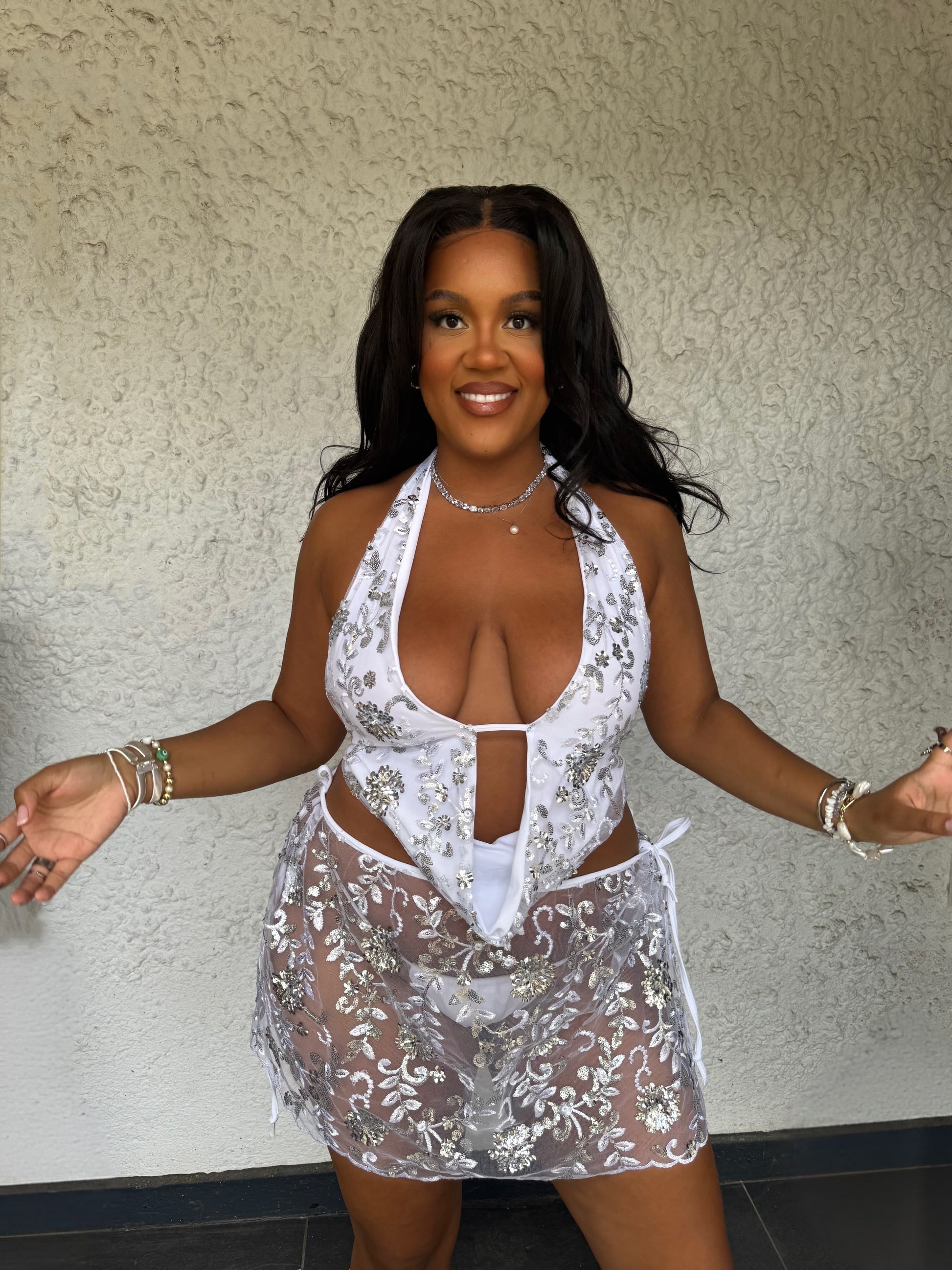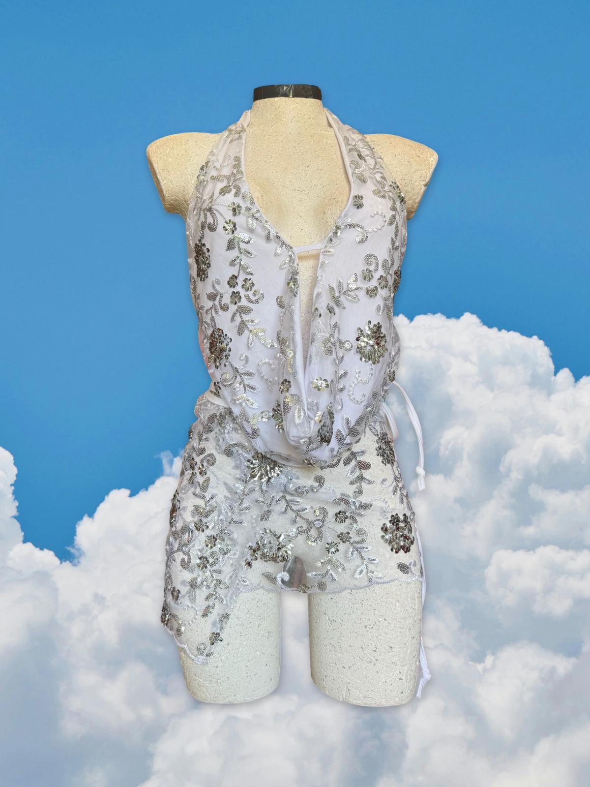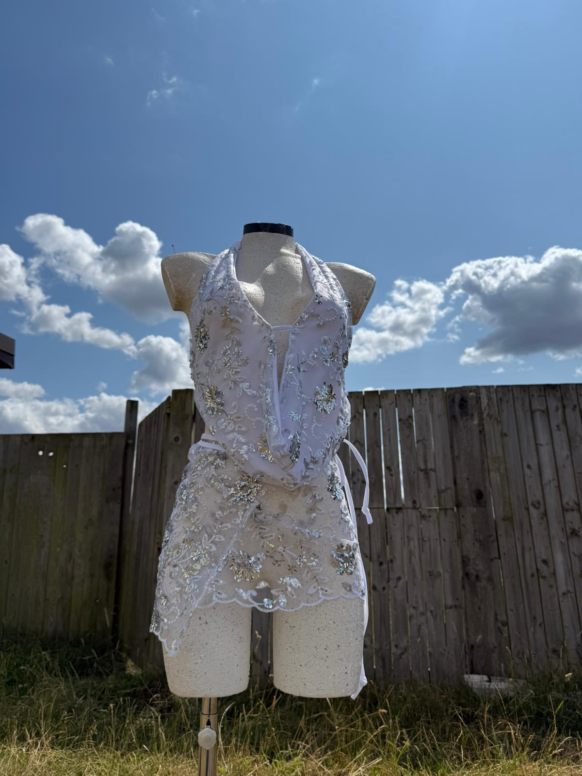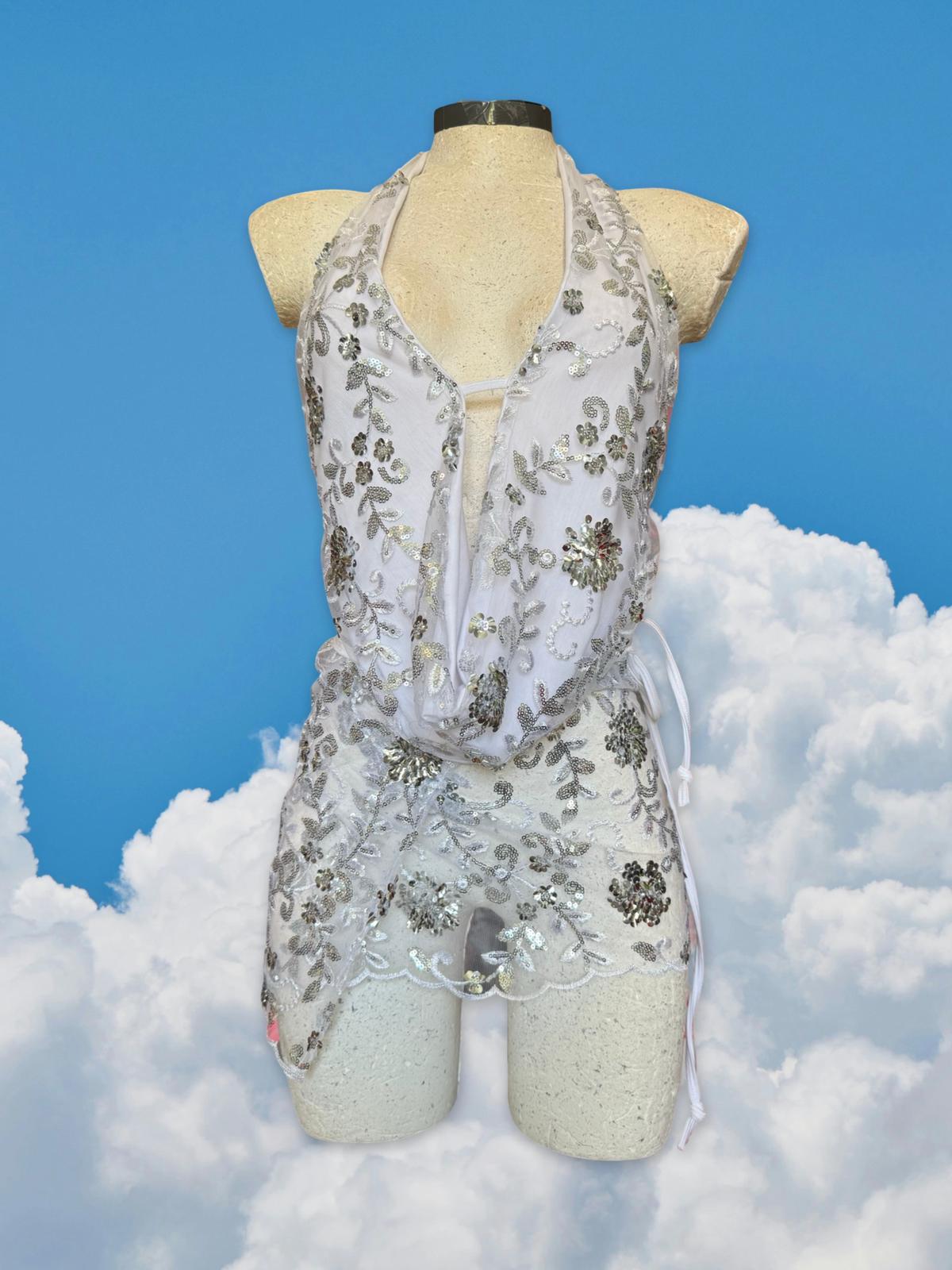 Adjustable matching wrap skirt, that wraps around the body. Unlined and fully sheer.