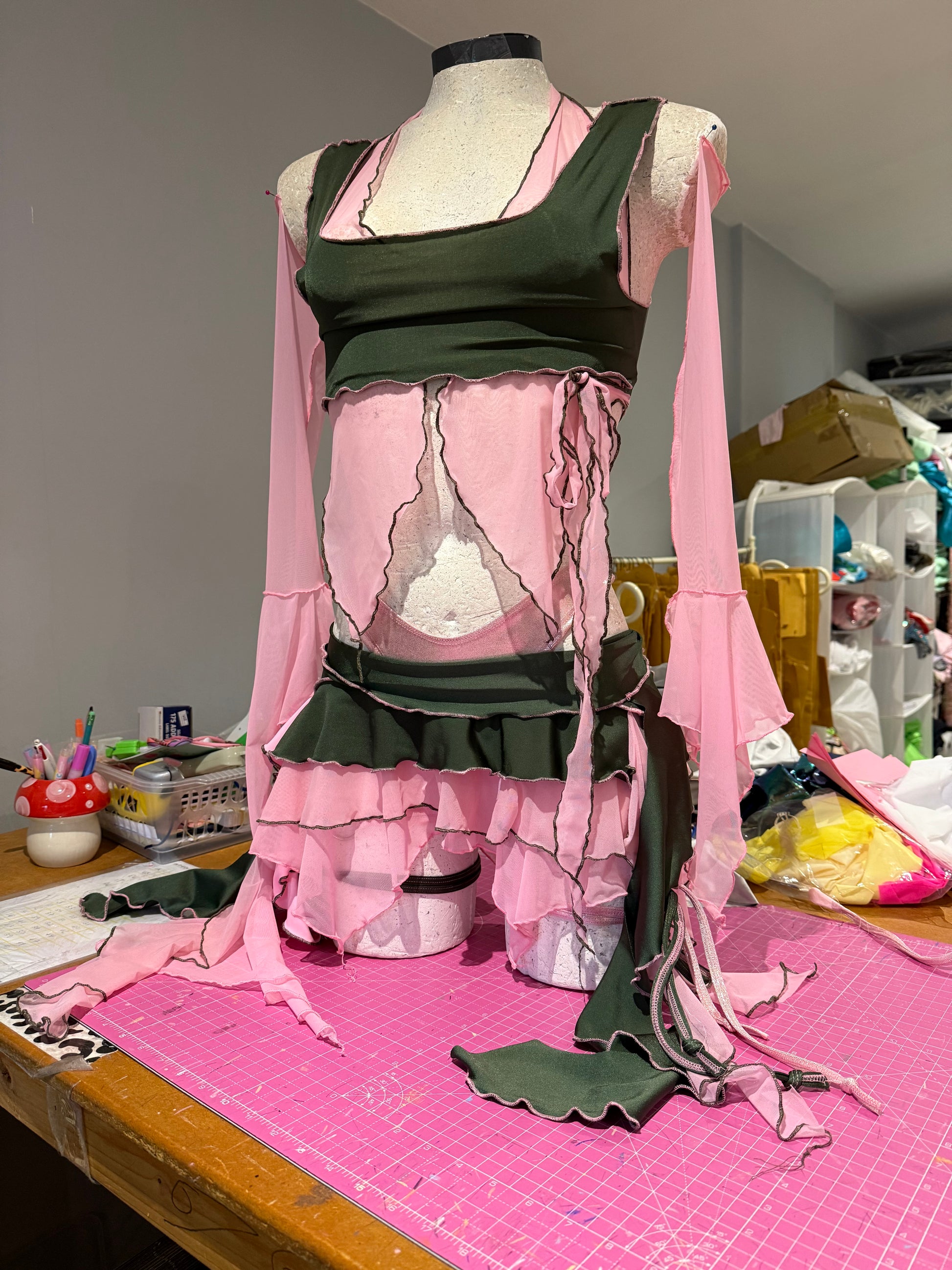 Embrace your inner whimsy with this enchanting fairy set. Made in semi sheer soft olive and pink hues, the set features delicately pointed mesh sleeves and a refined layered silhouette that floats against the skin. Paired with a high-rise thong and asymmetric ruffled skirt, this ‘fit delivers an otherworldly aesthetic perfect for those seeking the Fairy ring.