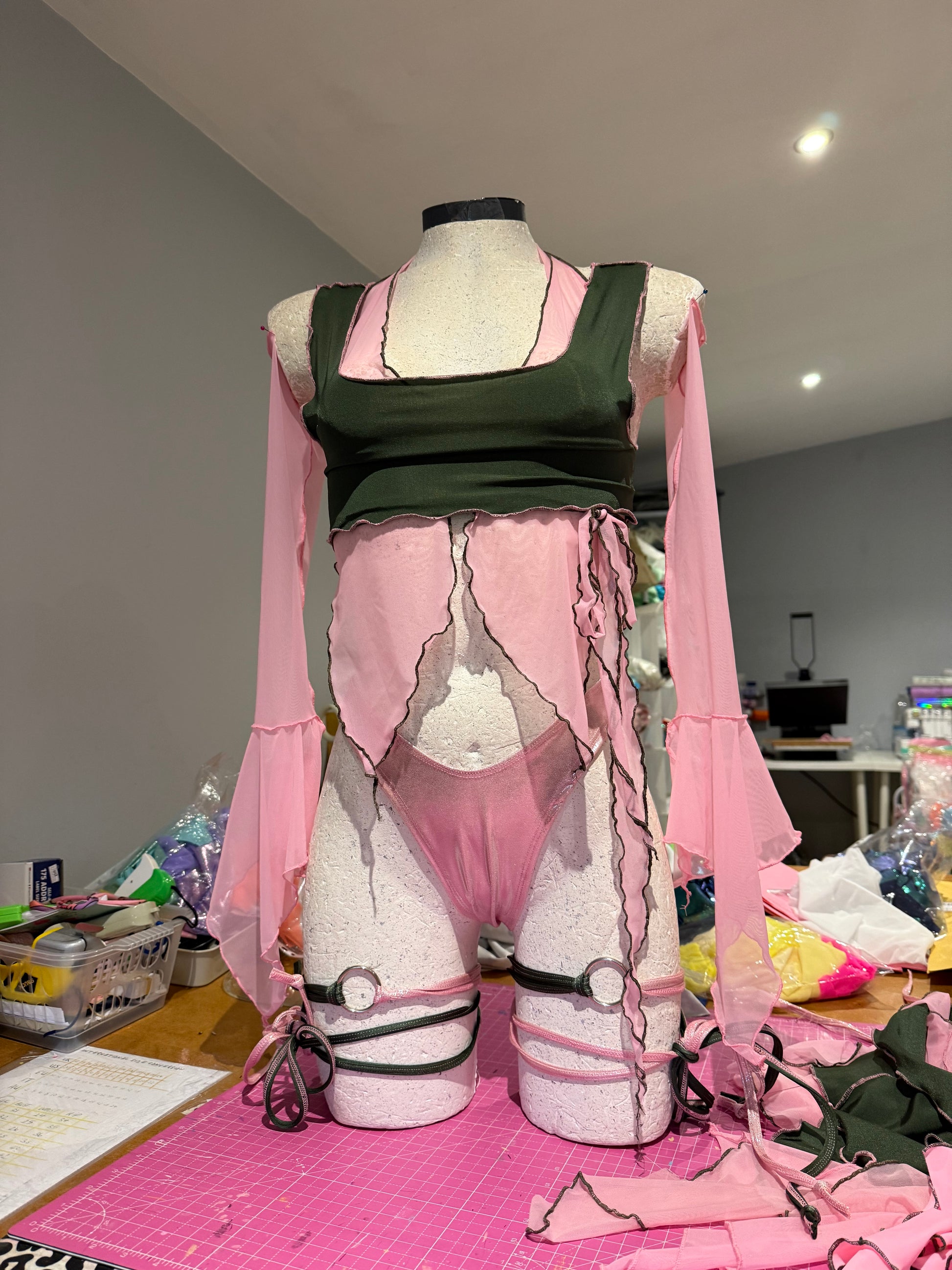 Embrace your inner whimsy with this enchanting fairy set. Made in semi sheer soft mint and lemon hues, the set features delicately pointed mesh sleeves and a refined layered silhouette that floats against the skin. Paired with a high-rise thong and asymmetric ruffled skirt, this ‘fit delivers an otherworldly aesthetic perfect for those seeking the Fairy ring.