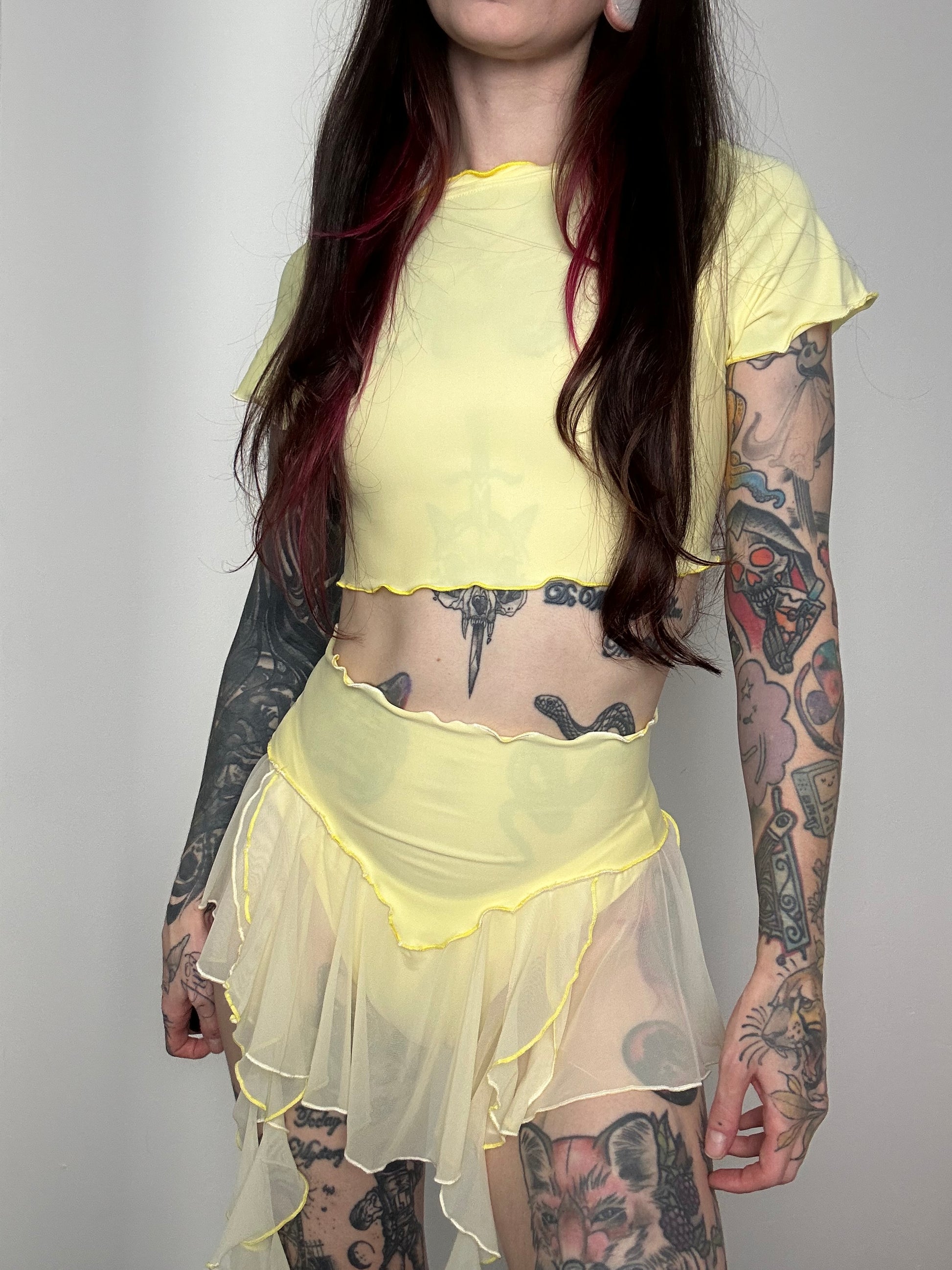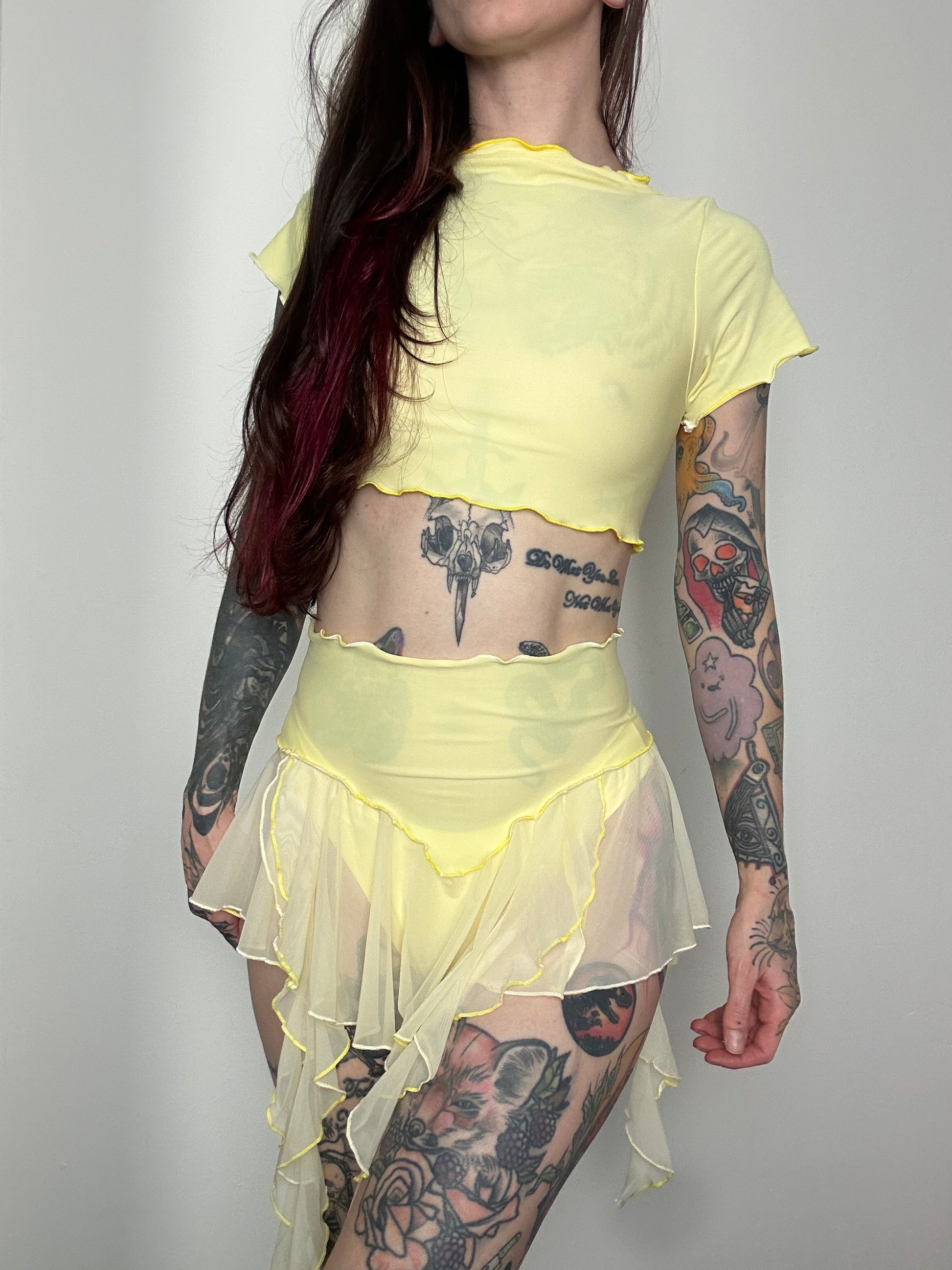 DAY 1 Lemon T-shirt Fairy Set: your ticket to effortless whimsy and undeniable charm. This delightful three-piece collection wraps you in buttery-soft, semi-sheer spandex that feels as dreamy as it looks.