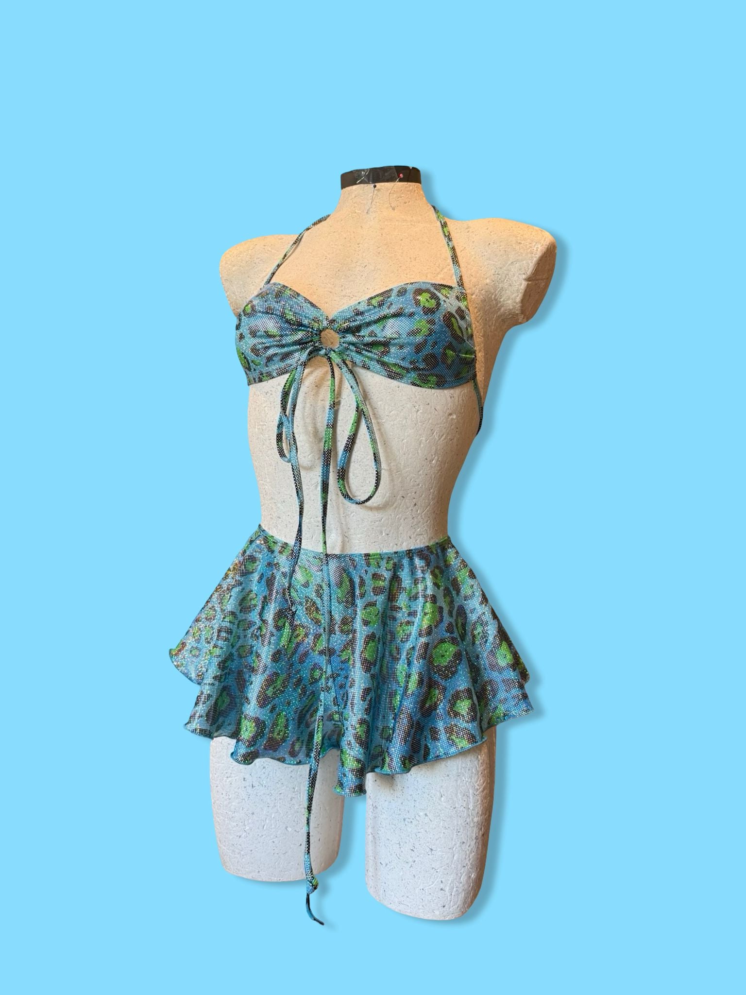 Cheeky mini skirt and multiway bikini top with matching mesh frills.