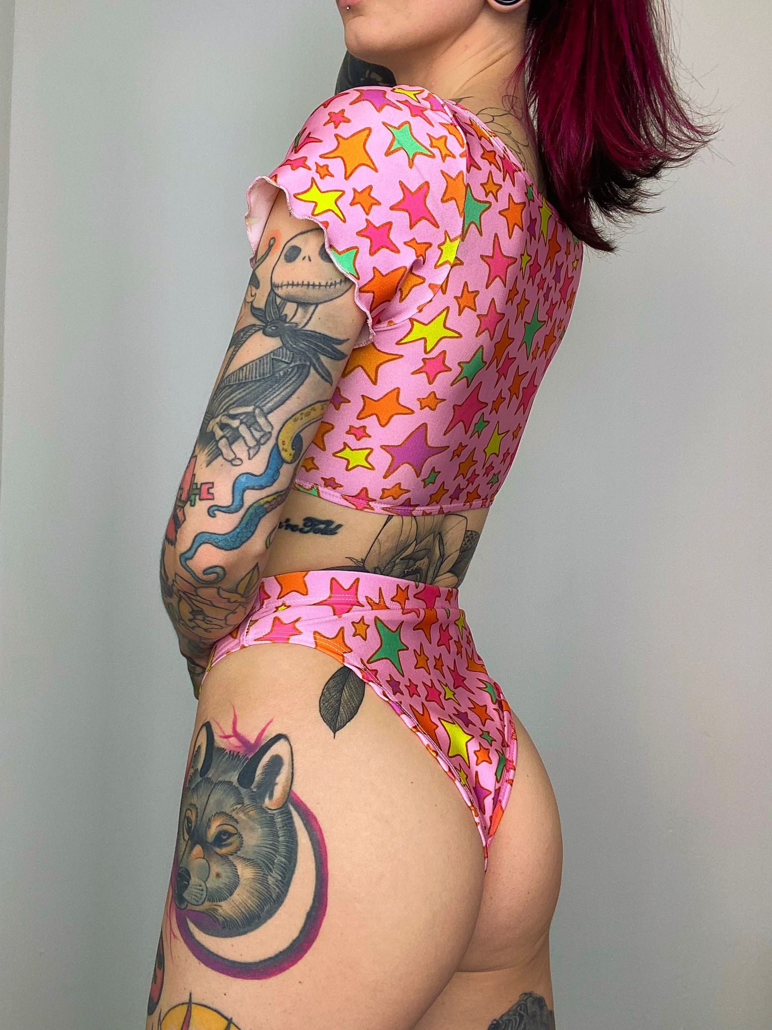Cropped tshirt top with high waisted bikini bottoms. Bottoms are high leg, if you want more coverage just pop a note you want them standard leg please.